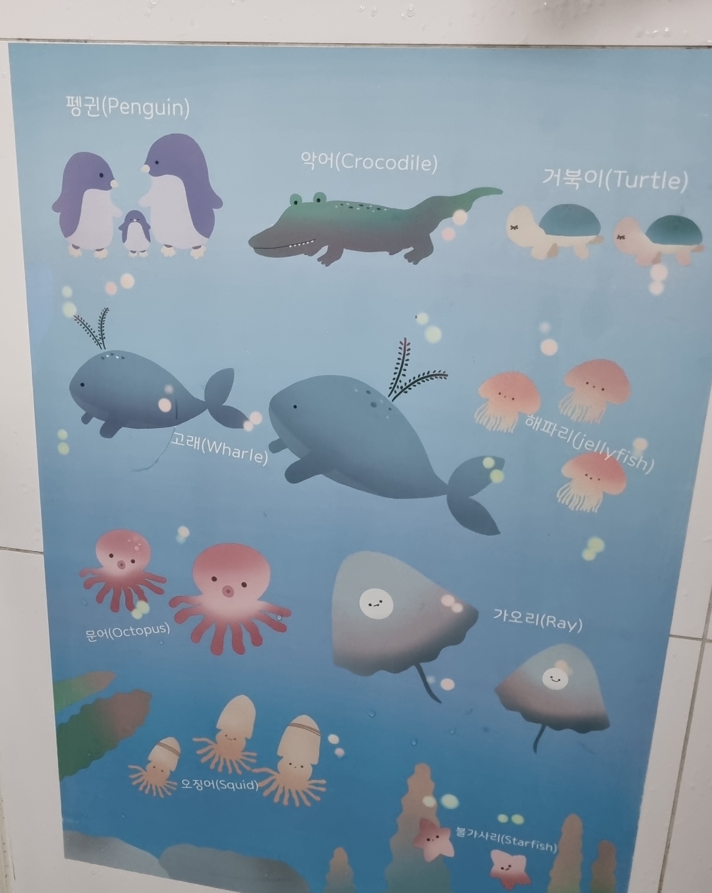 아기가 크고 바다동물에 대해 관심이 높아지면서 아이패드 프로크리에이트로 바다 동물들을 그려 방수포스터를 제작했다 아직 화장실에 붙어있고 가끔 쿵이가 보고 좋아한다 ㅎㅎ